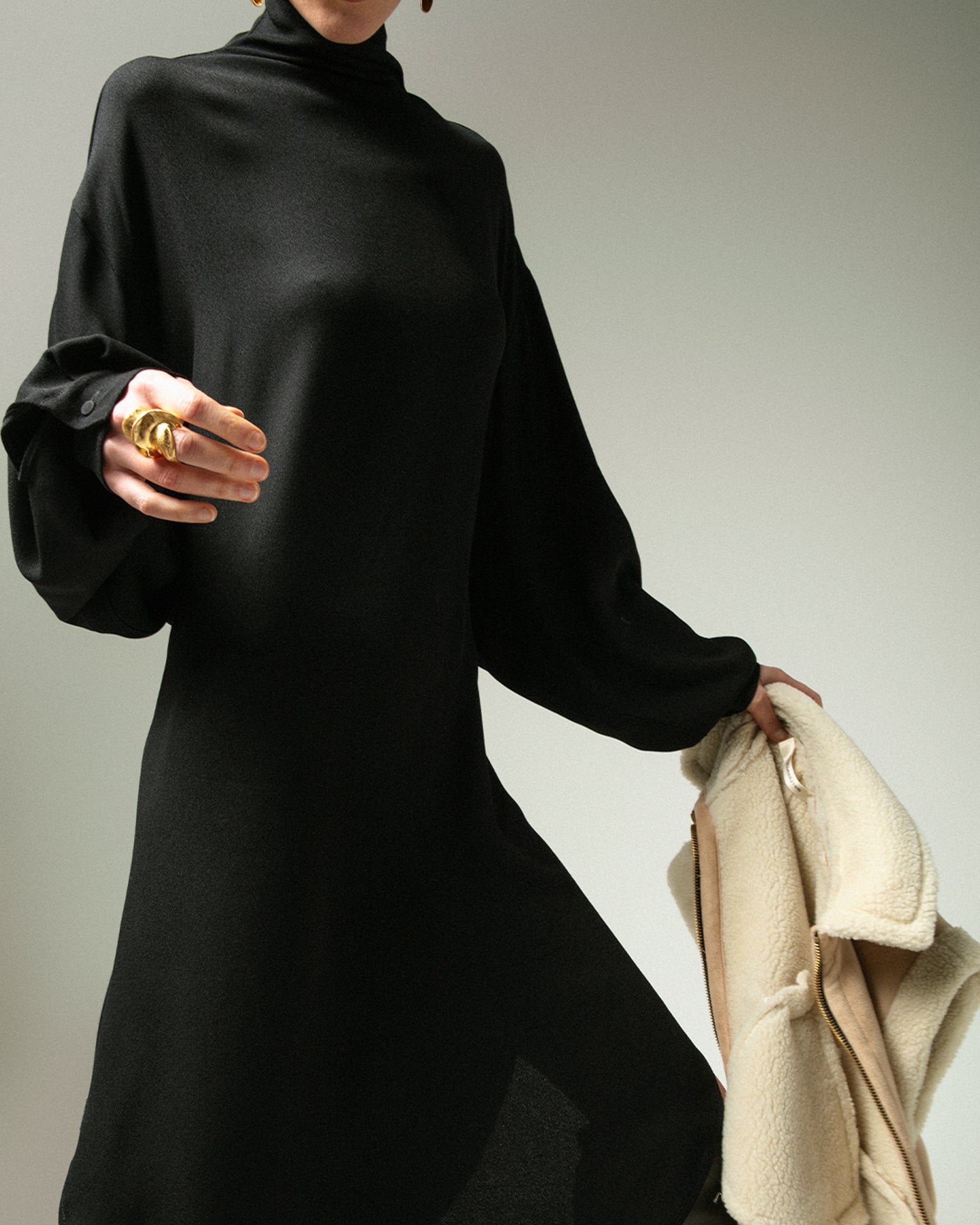 Abito midi con colletto e cinta, maniche ampie con polsini.Chiusura posteriore con zip.Vestibilità conforme alle taglie standard.